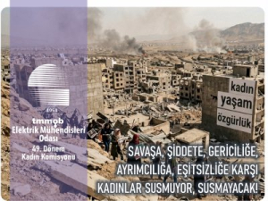 Elektrik Mühendisleri Odası 49. Dönem Kadın Komisyonu, 8 Mart Dünya Kadınlar Günü öncesinde yayımladığı basın açıklamasıyla savaşa, şiddete ve gerici politikalara karşı sesini yükseltti. Açıklamada İran`da süren çatışmalara dikkat çekilerek `savaşın birincil kurbanlarının her zaman kadınlar olduğu` vurgulandı. 2025 yılında en az 391 kadının erkekler tarafından katledildiğini hatırlatan komisyon, İstanbul Sözleşmesi`ne geri dönülmesini ve 6284 sayılı yasanın korunmasını talep etti....