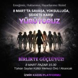 TMMOB İKK Kadın Çalışma Grubu, Dünya Kadınlar Günü etkinlikleri kapsamında 8 Mart`ta ; Savaşa, işgale, erkek-devlet şiddetine, yoksulluğa, sömürüye, homofobiye ve gericiliğe karşı `Emeğimiz, haklarımız, hayatlarımız bizim!` diyerek dayanışmayı güçlendirmek için bir araya geliyor.