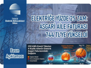 Enerji Piyasası Düzenleme Kurumu`nun (EPDK) 4 Nisan 2026 tarihinde yürürlüğe giren kararıyla konut elektrik tarifelerine yapılan yüzde 25 zamla ilgili Elektrik Mühendisleri Odası bir basın açıklaması yayımladı. Elektrik Mühendisleri Odası`nın (EMO) açıklamasında yer alan hesaplamalarına göre, 4 kişilik bir ailenin asgari yaşam standardı için ödemesi gereken aylık elektrik faturası 595,8 TL`den 744,7 TL`ye çıktı. Nisan 2026 itibarıyla faturanın yalnızca yüzde...